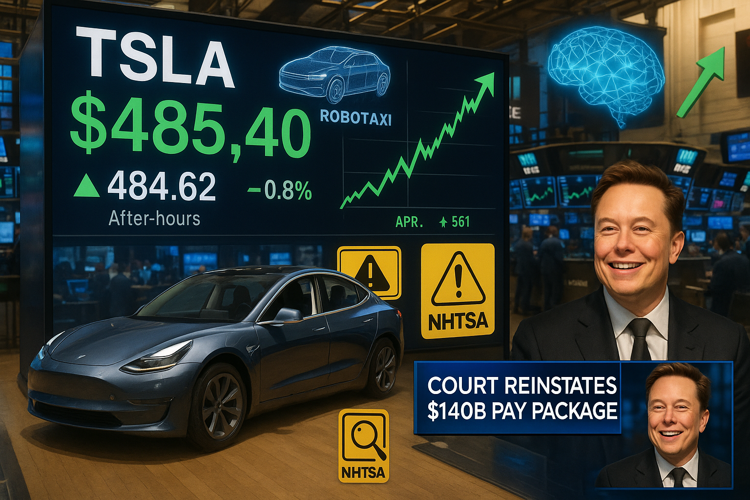 Illustration of Tesla stock at $485 amid NHTSA Model 3 probe, analyst upgrades, robotaxi hype, and Musk pay package win.