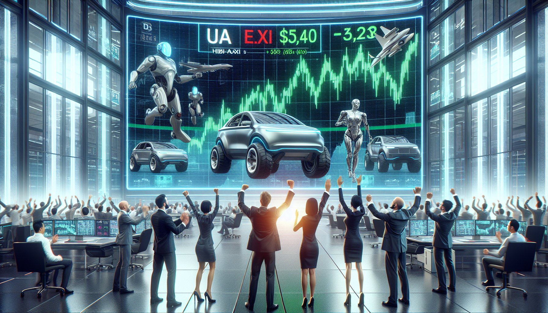 Realistic illustration of traders celebrating Tesla stock surge on exchange floor, with rising price graphs and images of Cybercab, Semi, and Optimus, amid easing US-China tensions.