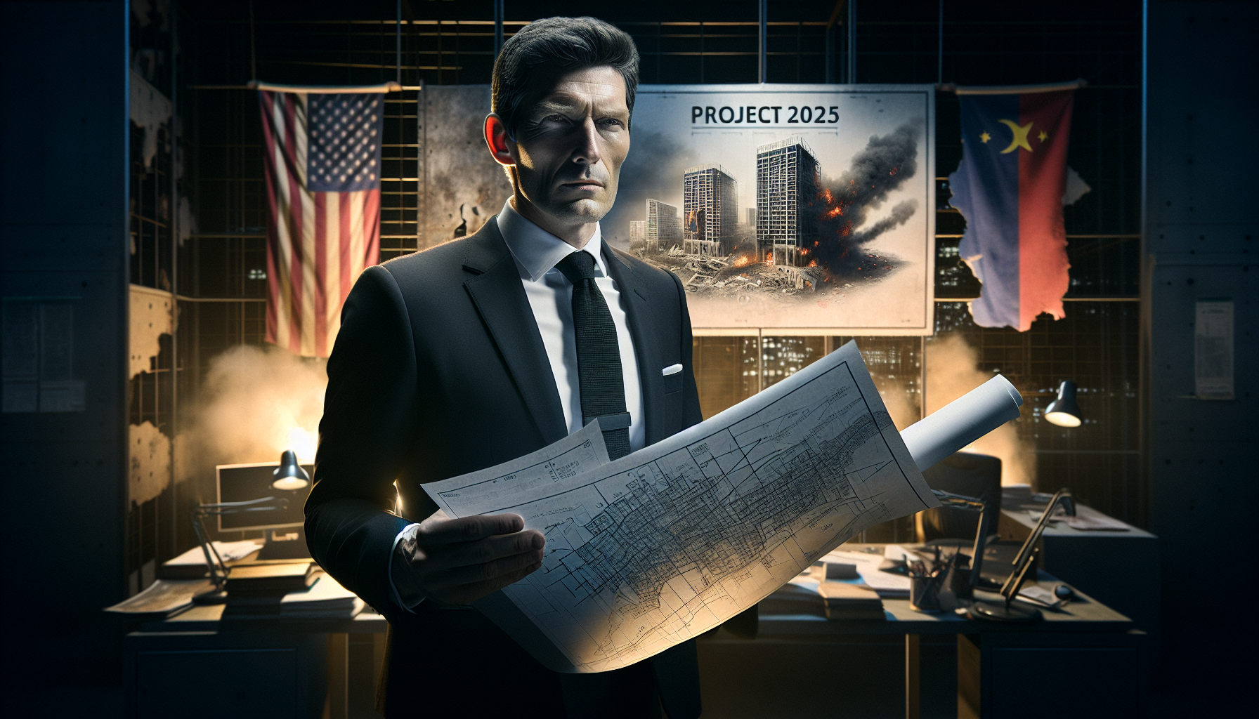 Illustration of Russ Vought as the architect of Project 2025, depicted in a realistic photo style with elements of destruction in the background.