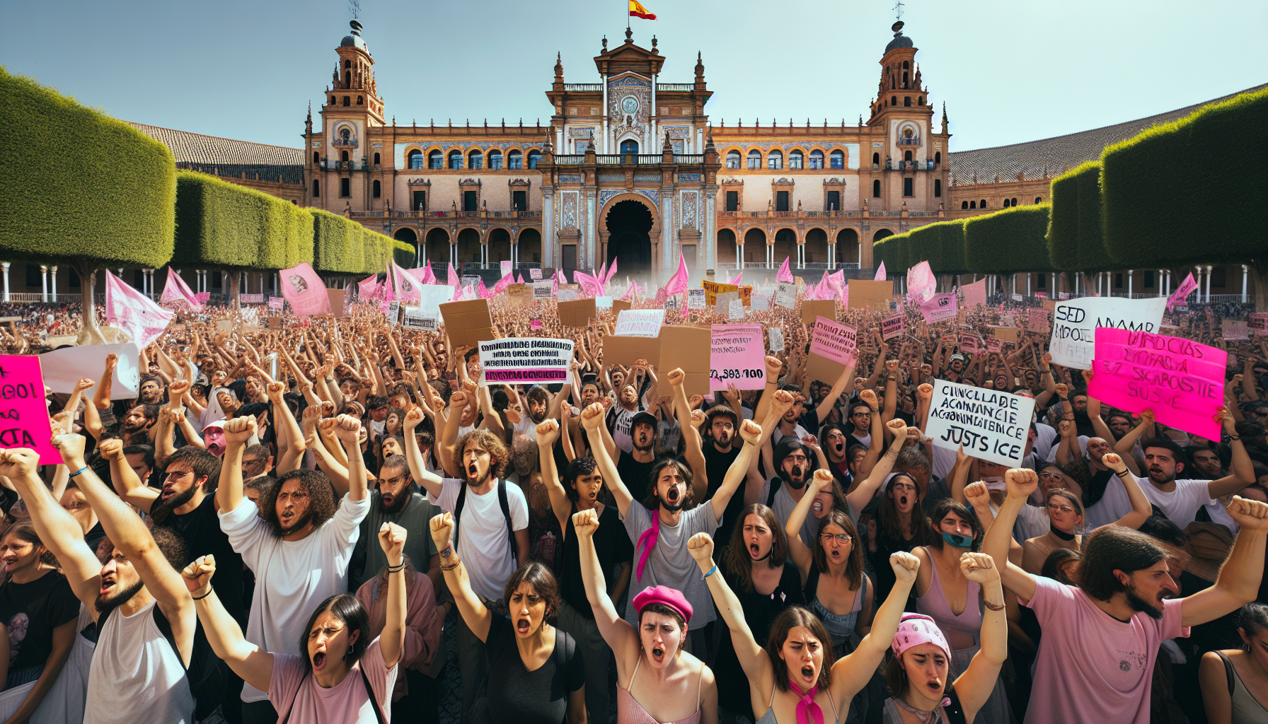 Thousands of protesters rally in front of Palacio de San Telmo in Seville against breast cancer screening failures, demanding government accountability.