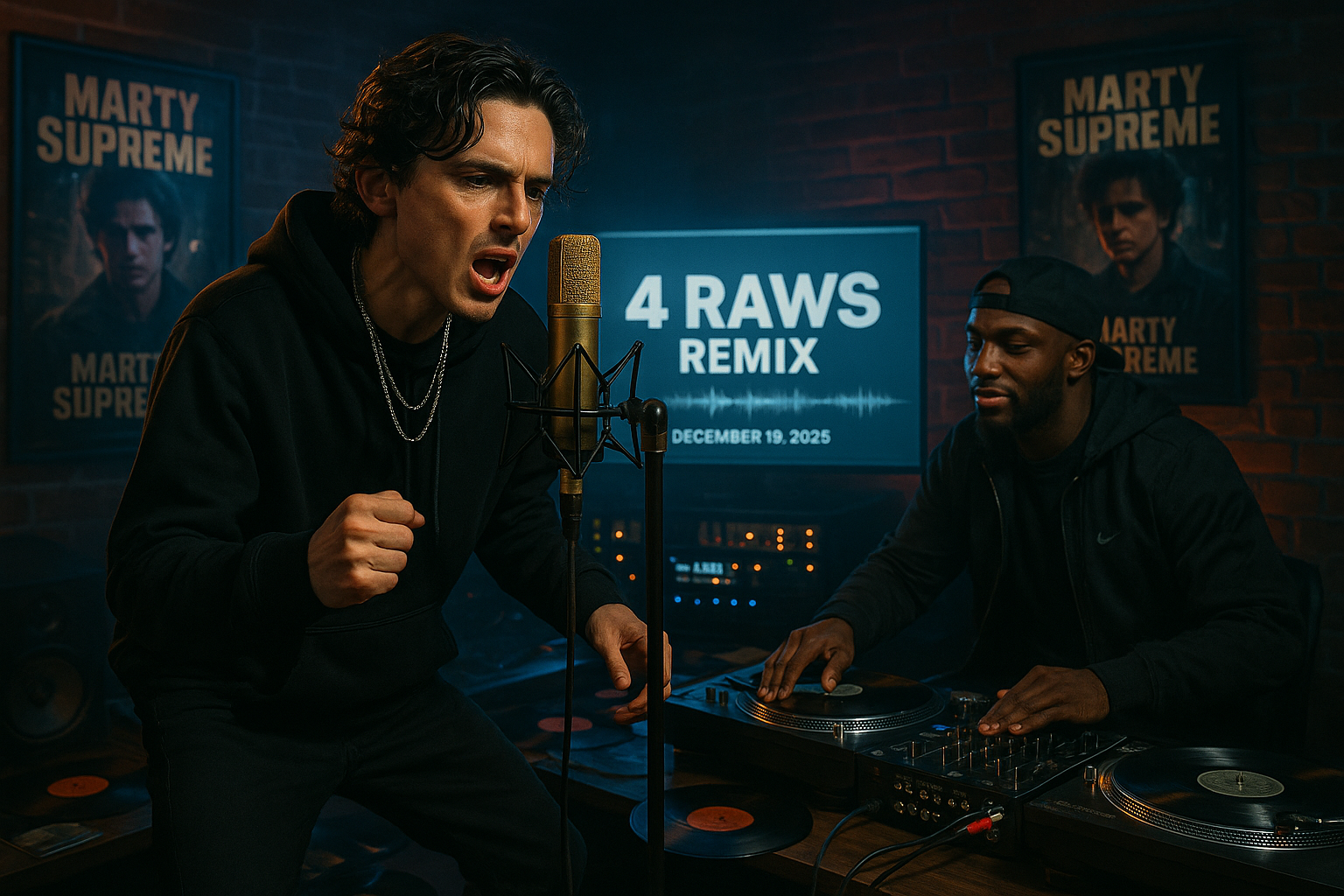 Timothée Chalamet rapping alongside UK rapper EsDeeKid in a recording studio for their '4 Raws' remix collaboration, promoting his film Marty Supreme.