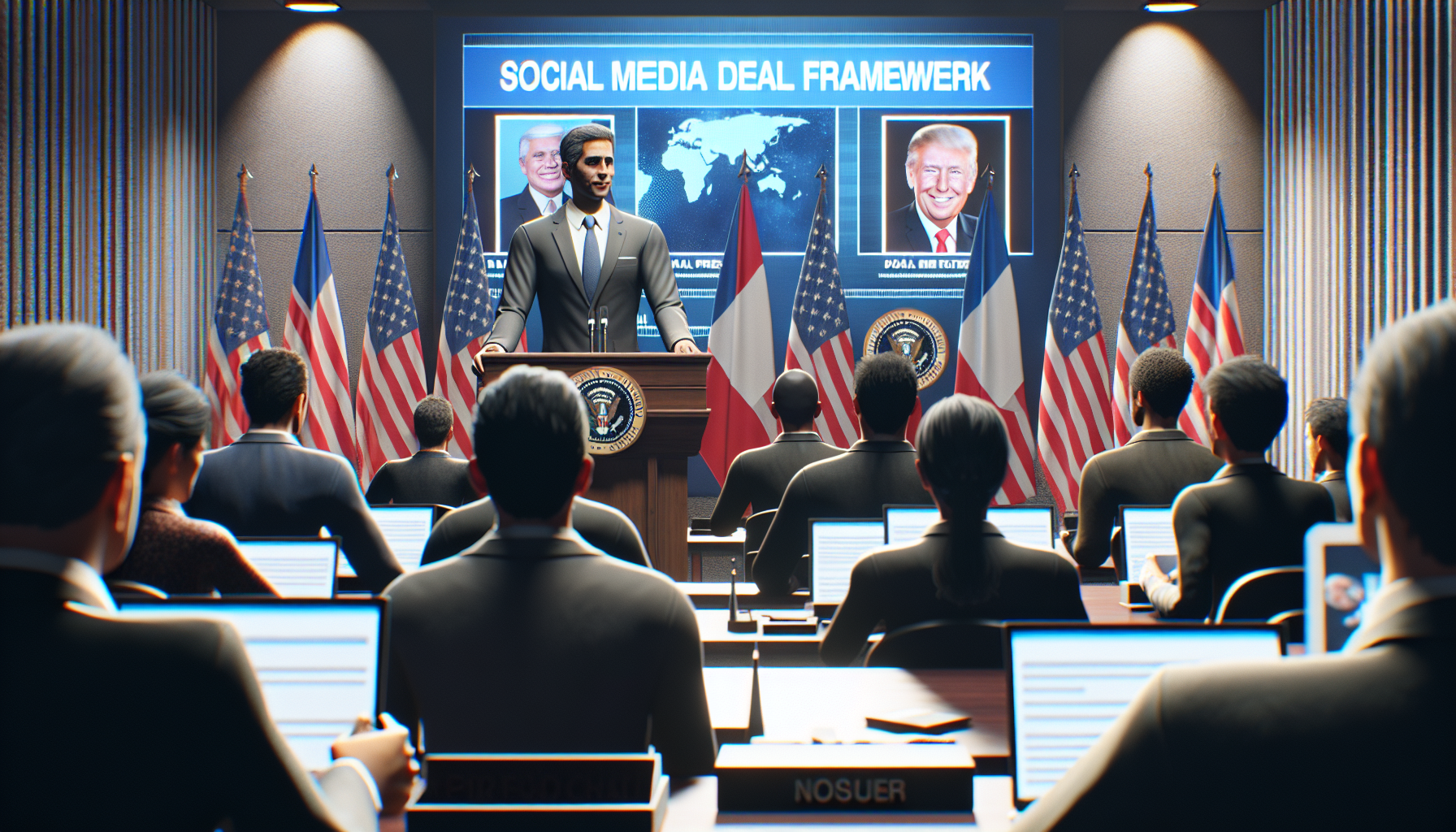 Treasury Secretary Scott Bessent announces TikTok framework ready for Trump and Xi's sign-off at a press conference with flags and logos.