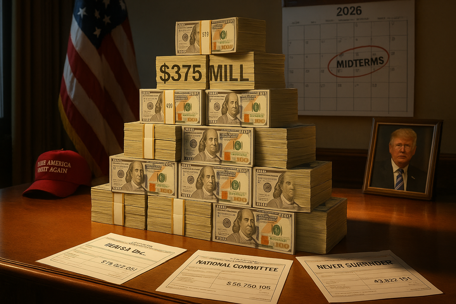 Illustration of $375 million cash stack symbolizing Trump political groups' funds for 2026 midterms.