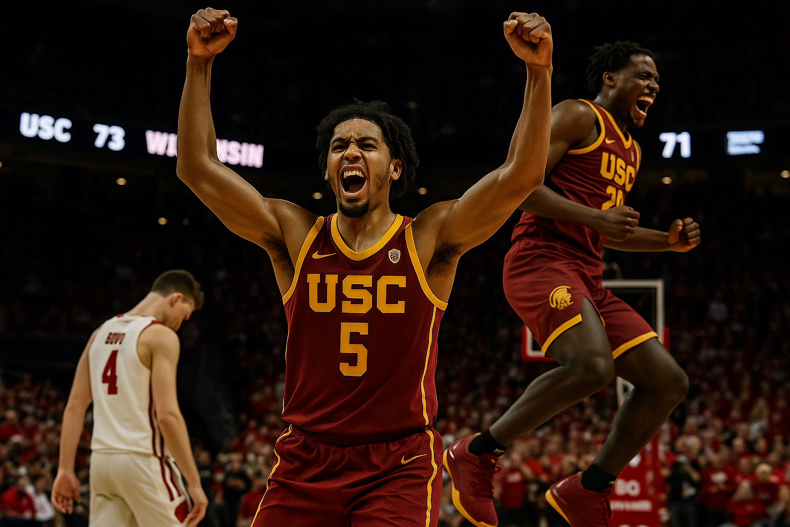 USC Trojans' Chad Baker-Mazara celebrates 73-71 upset win over Wisconsin Badgers, ending five-game streak.
