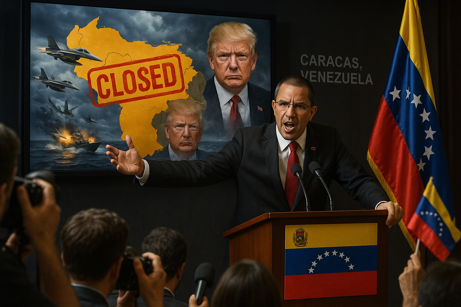 Illustration of Venezuelan official condemning Trump's airspace closure threat amid U.S. anti-drug airstrikes in the Caribbean.