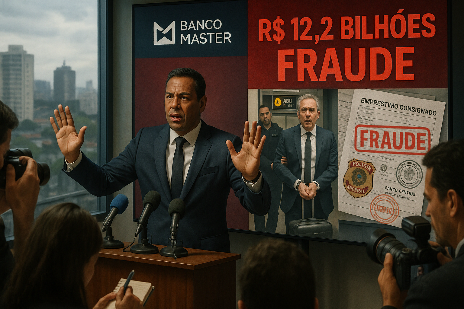 Lawyer denying R$12.2 billion Banco Master fraud allegations at press conference, with images of arrested banker Vorcaro and evidence.