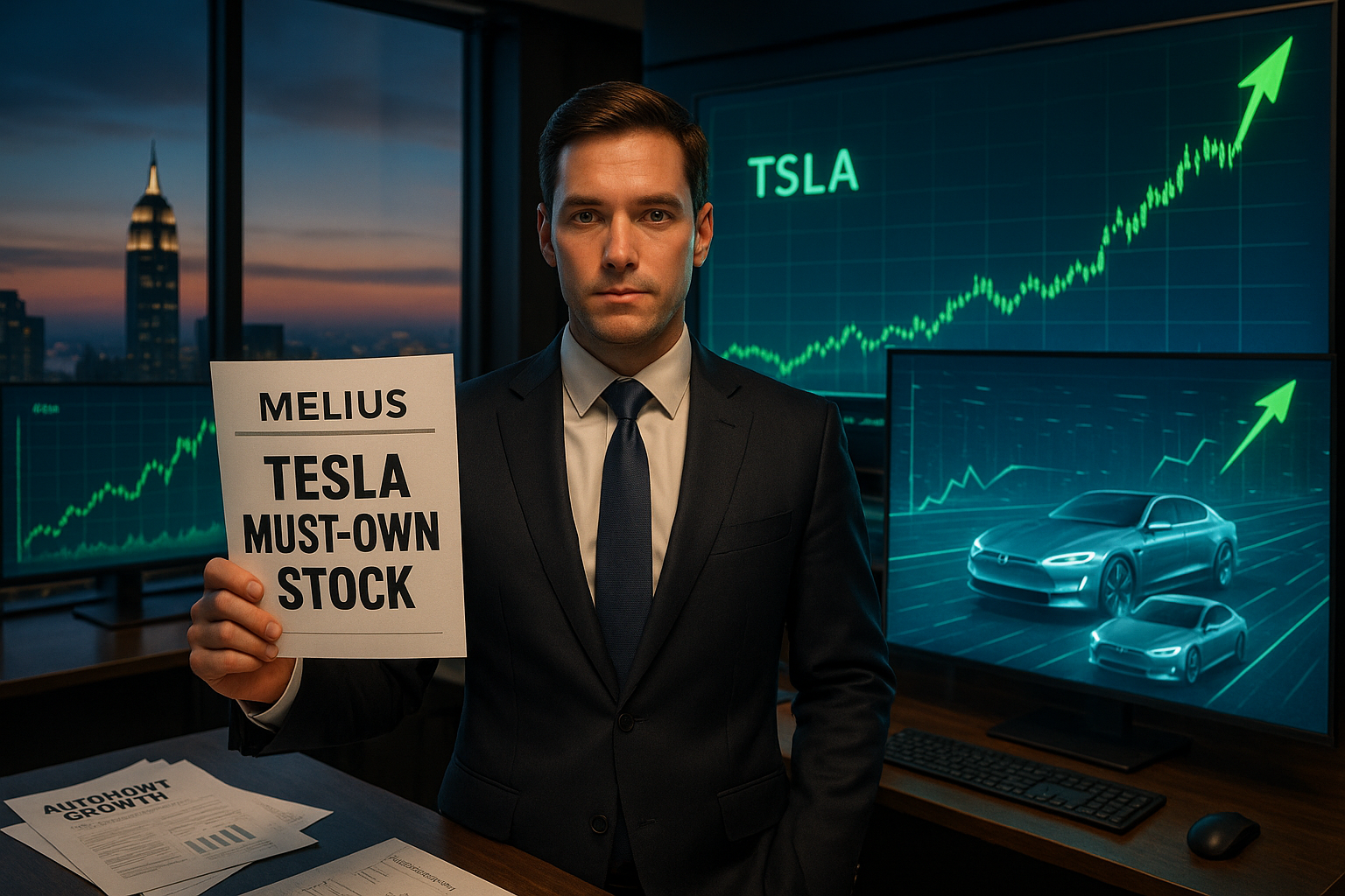 Wall Street analyst endorsing Tesla stock as 'must-own' with self-driving tech visuals and rising charts.