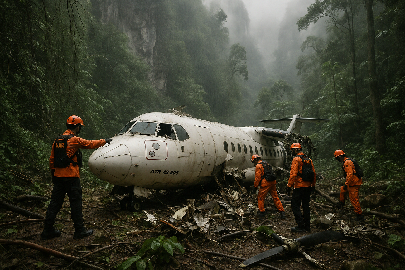 SAR team examines wreckage of crashed ATR 42-500 plane in Bulusaraung National Park amid rugged terrain and poor weather.