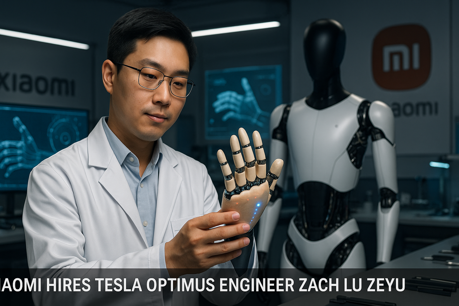 Illustration depicting Xiaomi's recruitment of former Tesla Optimus engineer Zach Lu Zeyu to lead dexterous robotic hand R&D in a high-tech lab.