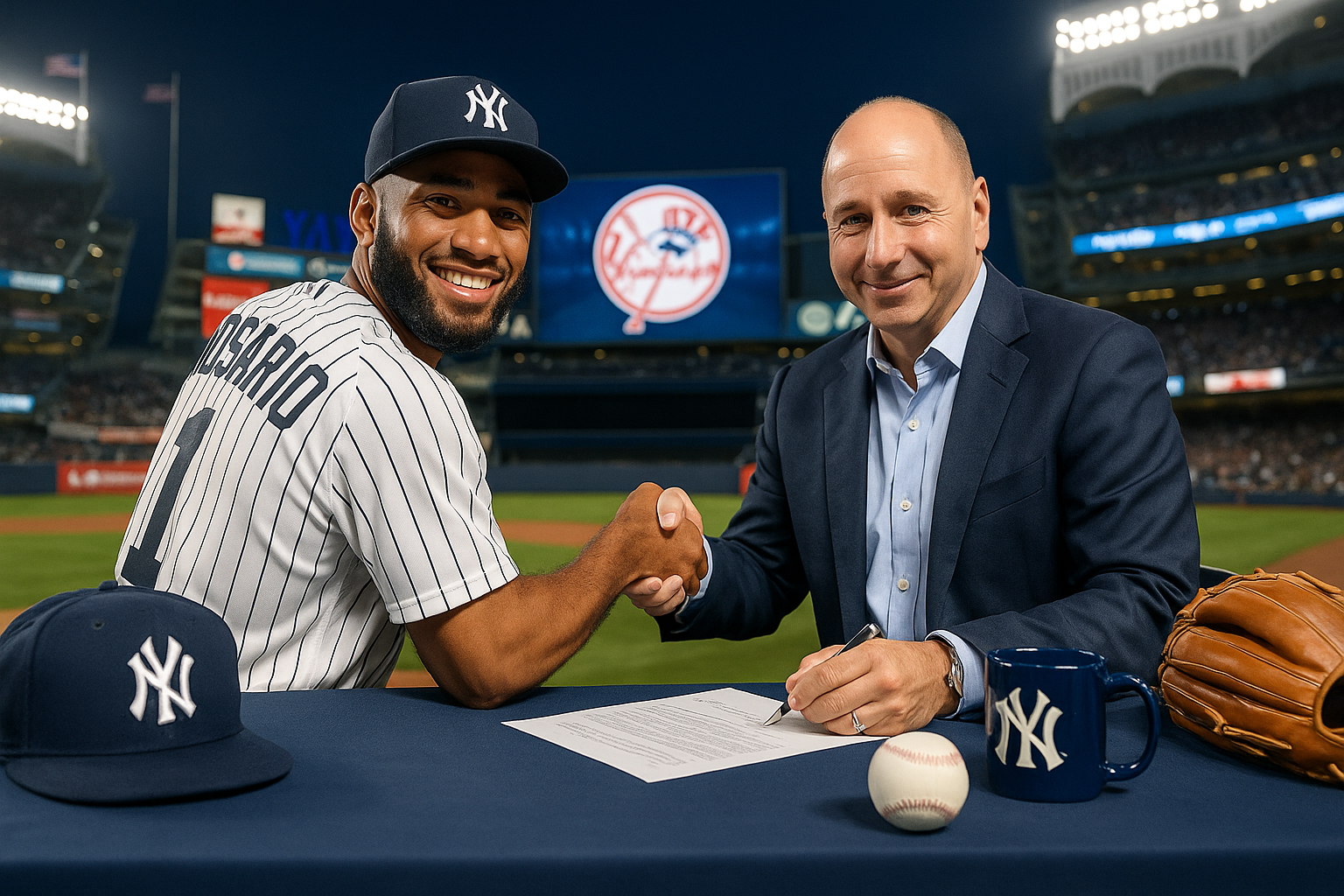 Amed Rosario of the New York Yankees signs his one-year contract extension alongside GM Brian Cashman at Yankee Stadium.