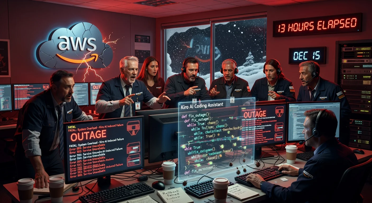 Dramatic illustration of AWS engineers responding to a 13-hour outage triggered by the Kiro AI coding tool in a high-tech control room.