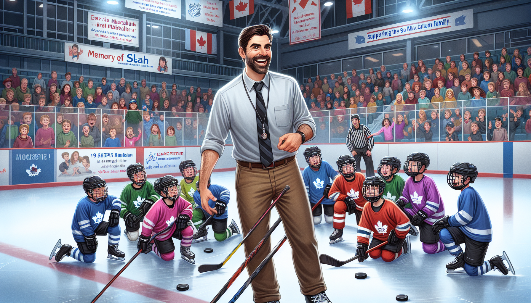 Brad Marchand coaching a youth hockey team in Nova Scotia, with elements of fundraising and support for a family affected by cancer, illustrating community compassion.