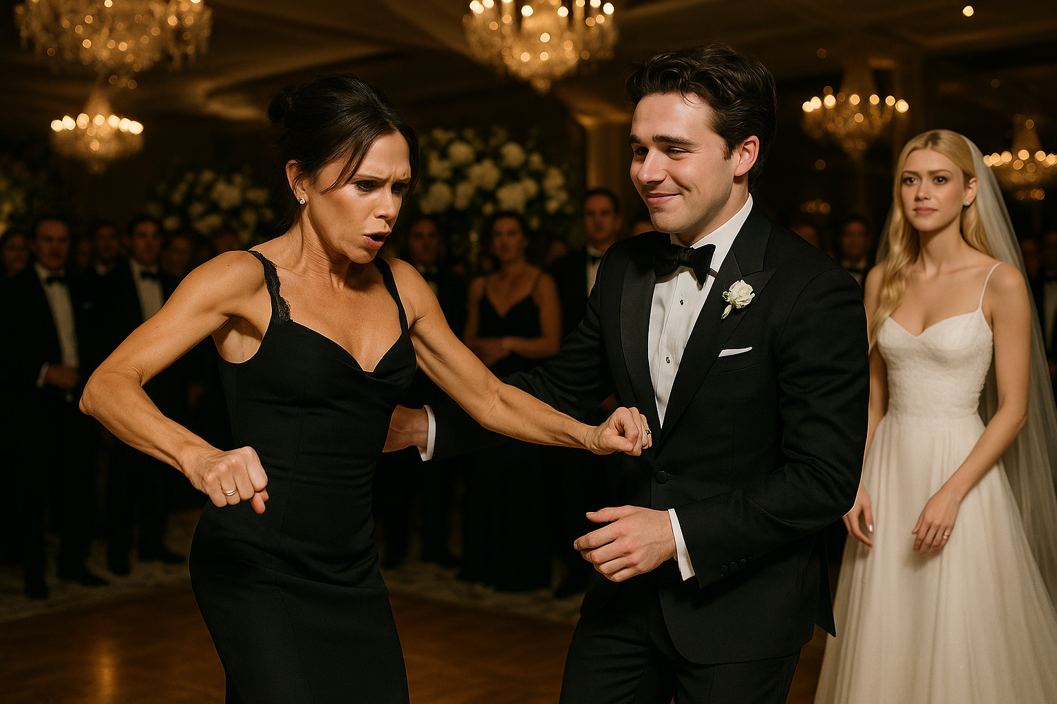Illustration of Victoria Beckham's awkward dance with son Brooklyn at his 2022 wedding to Nicola Peltz, reason for keeping wedding video private.