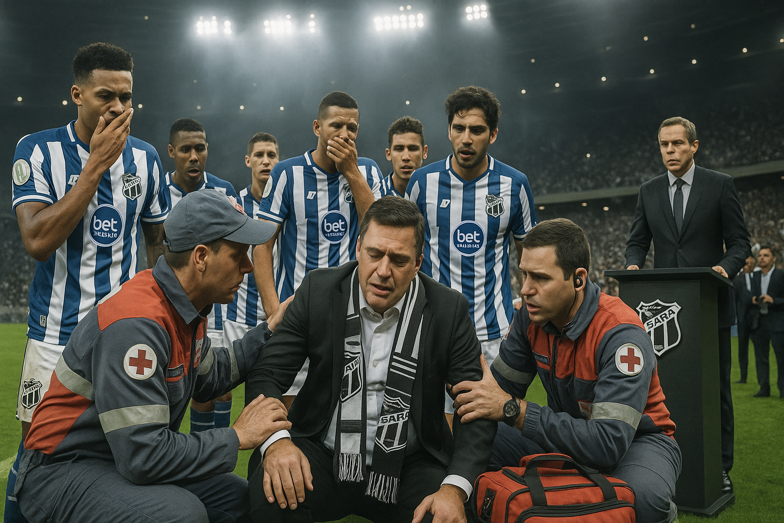 Ceará president João Paulo Silva receives urgent medical attention after the team's relegation defeat to Palmeiras at Arena Castelão.