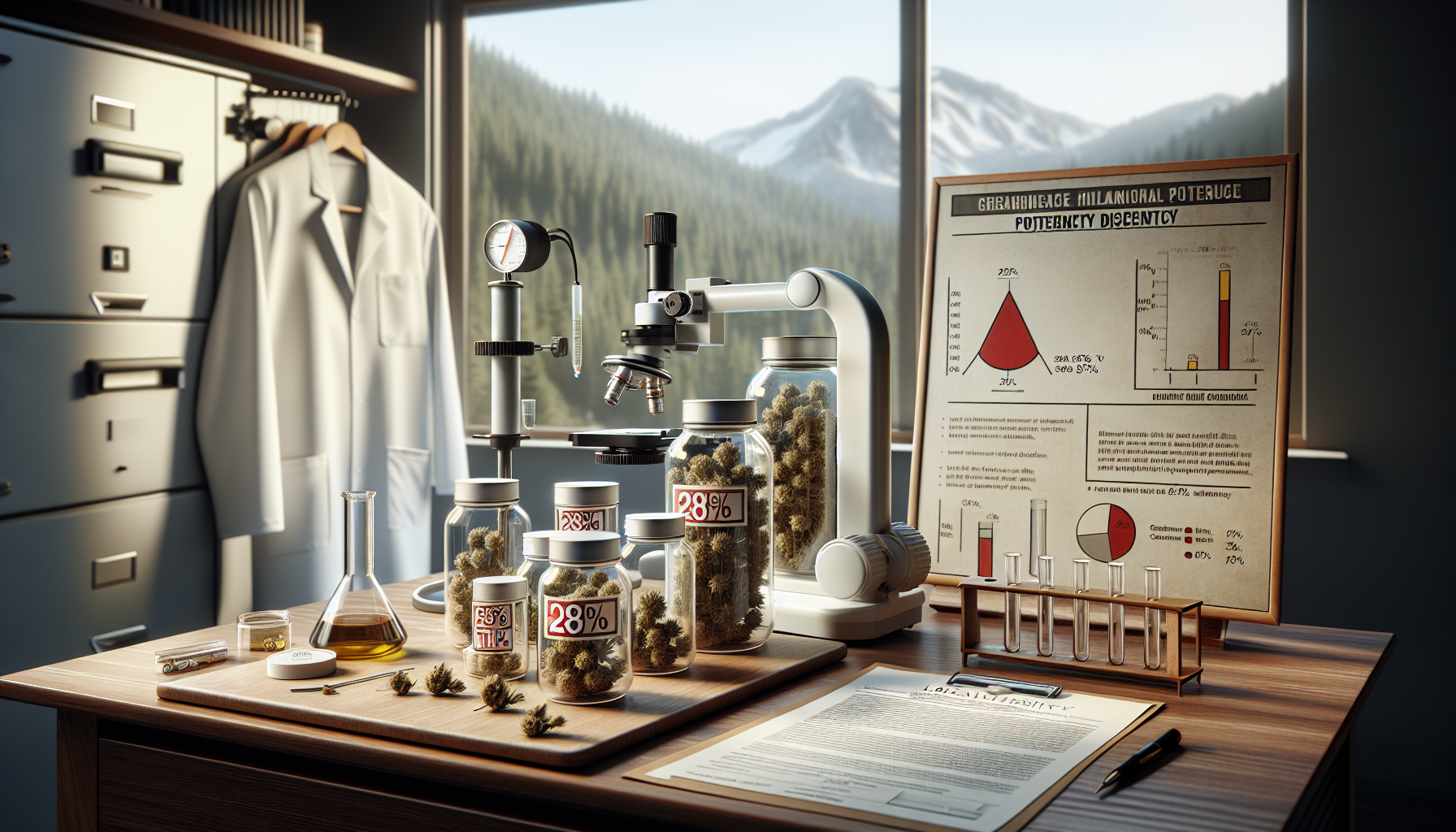 Laboratory scene showing cannabis flower products with overstated THC labels next to accurate testing equipment and an audit report, illustrating Colorado's cannabis potency labeling issues.