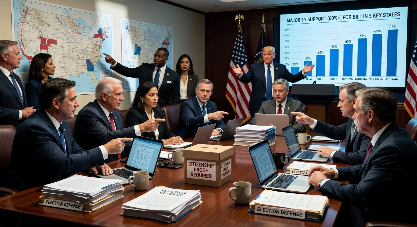 Dramatic split-scene illustration of Democratic attorneys general strategizing against Trump's proof-of-citizenship voting bill, backed by a supportive Heritage poll.