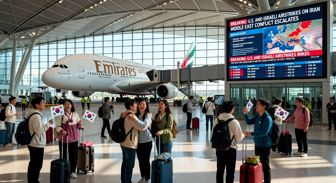 Relieved South Korean nationals boarding direct flight from Dubai to Incheon amid Middle East conflict, hopeful return home.