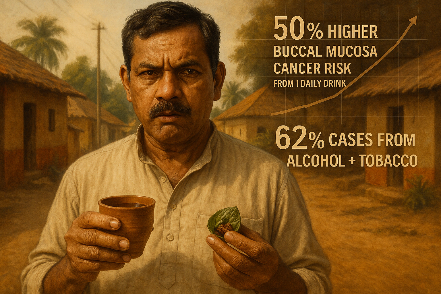 Realistic illustration of an Indian man holding alcohol and chewing tobacco, with overlaid stats on buccal mucosa cancer risk from a new study.
