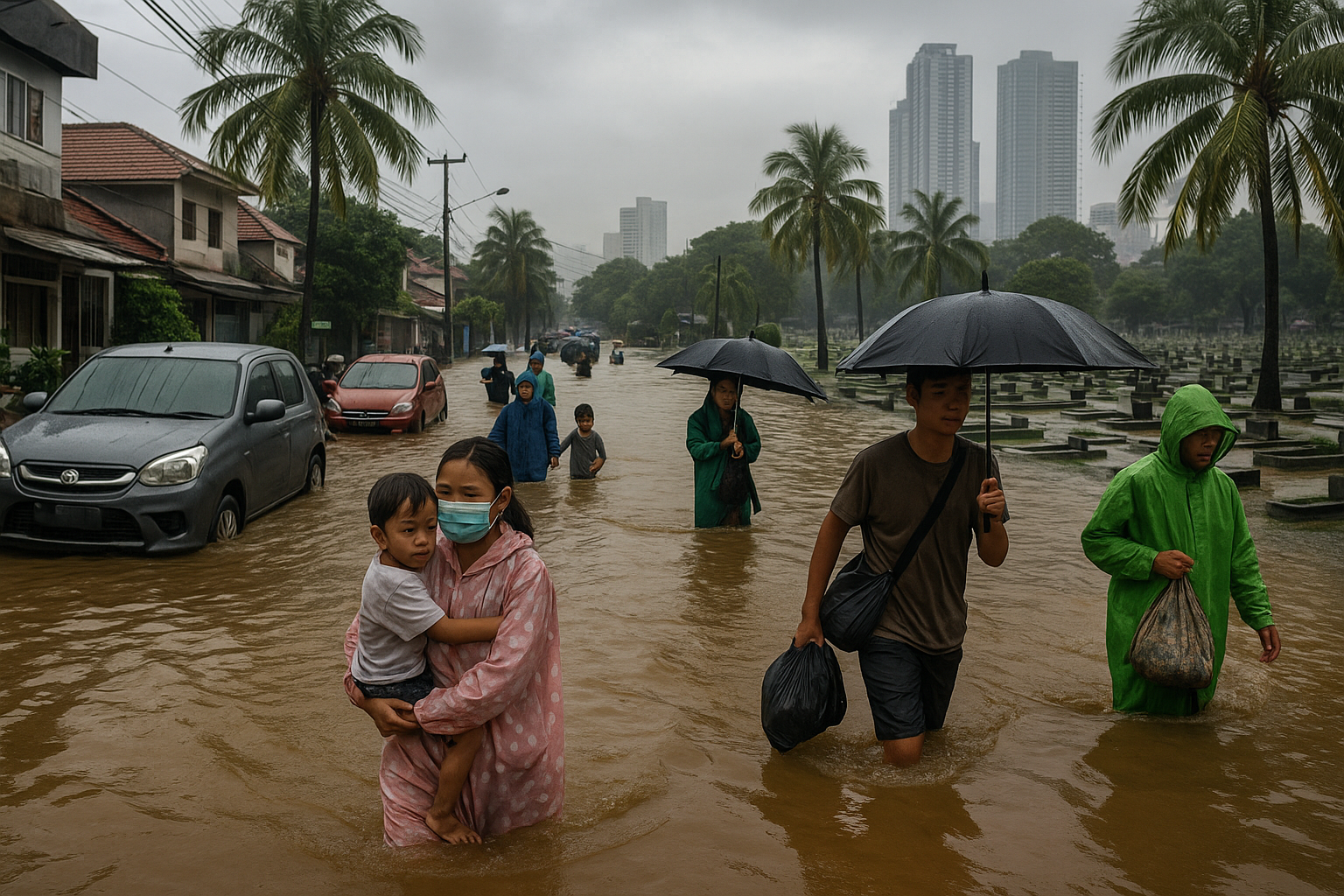 Starke Regenfälle prasseln seit Samstagnacht, 17. Januar 2026, auf Jakarta nieder und haben Überschwemmungen in mehreren Gebieten ausgelöst. Laut der Behörde für Katastrophenminderung Jakarta (BPBD DKI Jakarta) waren um 06:00 WIB am Sonntag, 18. Januar, fünf Viertel (RT) und drei Straßen überschwemmt. In Nord-Jakarta war ein RT im Kelurahan Ancol mit 25 cm Wasser überflutet. West-Jakarta verzeichnete drei RTs im Kelurahan Kedaung Kali Angke mit Tiefen bis zu 60 cm, während Ost-Jakarta ein RT im Kelurahan Rawa Terate mit ca. 40 cm hatte. Drei Straßen in West-Jakarta – Jalan Perumahan Green Garden in Kedoya Utara, Jalan Pangeran Tubagus Angke in Wijaya Kusuma und Jalan Pangeran Tubagus Angke Raya in Jelambar Baru – standen unter 20 cm Wasser. Ein Update um 09:52 WIB zeigte einen starken Anstieg: 16 RTs überschwemmt, davon 13 in West-Jakarta (acht in Kedaung Kali Angke, vier in Tegal Alur, eines in Jelambar), zwei in Nord-Jakarta (eines in Ancol und in Pademangan Barat; Quellen nennen insgesamt zwei RTs) und eines in Rawa Ternate, Ost-Jakarta. Zehn Straßen waren betroffen, darunter Jalan Perumahan Green Garden (15 cm), Jalan Pangeran Tubagus Angke (20 cm), Jalan Pangeran Tubagus Angke Raya (20 cm), Jalan Lingkar Luar Barat (20 cm), Jalan Karang Bolong Raya (70 cm), Jalan Kampung Sepatan (30 cm), Jalan Cakung Cilincing Raya (20 cm), Jalan Daan Mogot KM 13 (15 cm), Jalan Boulevard Barat (15 cm) und Jalan Industri VI (10 cm). Zusätzlich überschwemmten Fluten Gräber auf dem öffentlichen Friedhof Pondok Kelapa (TPU) in Duren Sawit, Ost-Jakarta, mit 30 cm Wasser in niedrig gelegenen Bereichen seit dem Morgen. „Aufgrund extrem starker Niederschläge seit gestern Nachmittag. Einige Gräber stehen unter Wasser, nur die oberen Teile (Grabsteine) sind sichtbar“, sagte der Sicherheitsbeamte des TPU, Muhadi. Das stehende Wasser wich zurück, nachdem das Personal die Entwässerungskanäle gereinigt hatte, und die Bedingungen normalisierten sich in höheren Bereichen. Leiter des Daten- und Informationszentrums für Katastrophen bei BPBD DKI Jakarta, Mohamad Yohan, forderte die Öffentlichkeit zur Wachsamkeit auf. „In Notfällen rufen Sie sofort 112 an. Dieser Dienst ist kostenlos und rund um die Uhr verfügbar“, sagte er. BPBD führt zudem Wettermodifikationen durch, um weitere Überschwemmungsrisiken zu mindern.