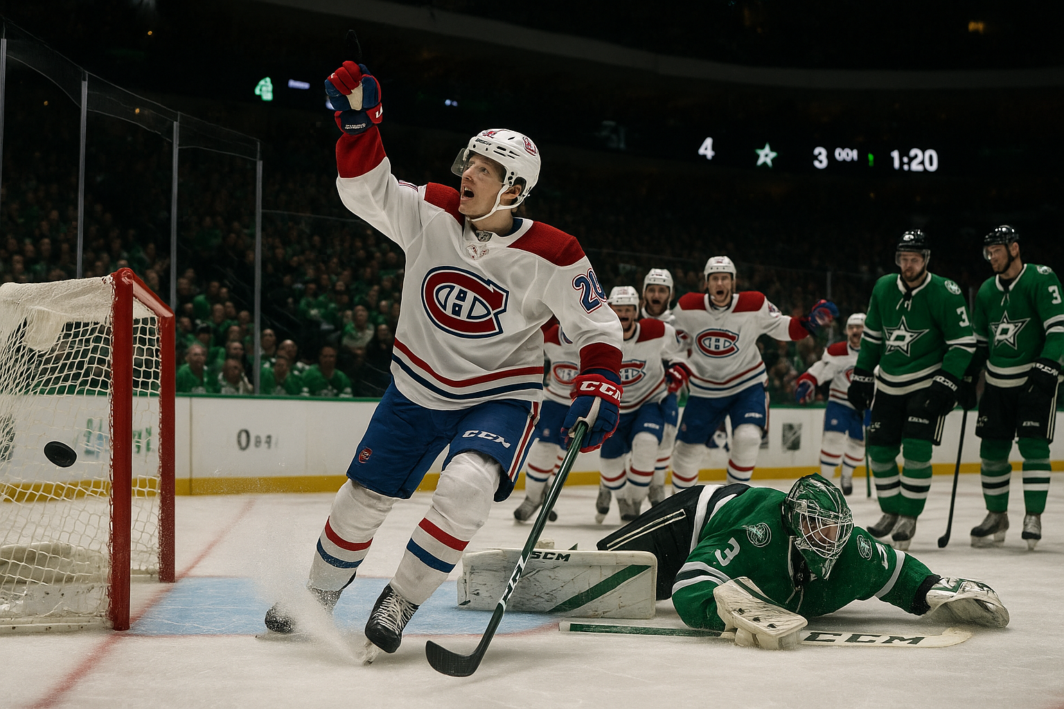 Brendan Gallagher opened the scoring at 8:42 of the first period, deflecting a shot from Alexandre Carrier for a 1-0 lead, assisted by Danault. Mavrik Bourque tied it 1-1 at 13:53 with a wraparound goal. In the second period, Wyatt Johnston gave Dallas a 2-1 edge at 10:14 on a power-play expiration shot from the slot, assisted by Mikko Rantanen and Scott Harley. Oliver Kapanen equalized at 11:59 with a one-timer from the left circle, assisted by Ivan Demidov and Juraj Slafkovsky. Slafkovsky then put Montreal ahead 3-2 at 18:39 on a power-play goal from the slot, with assists from Nick Suzuki and Hutson.