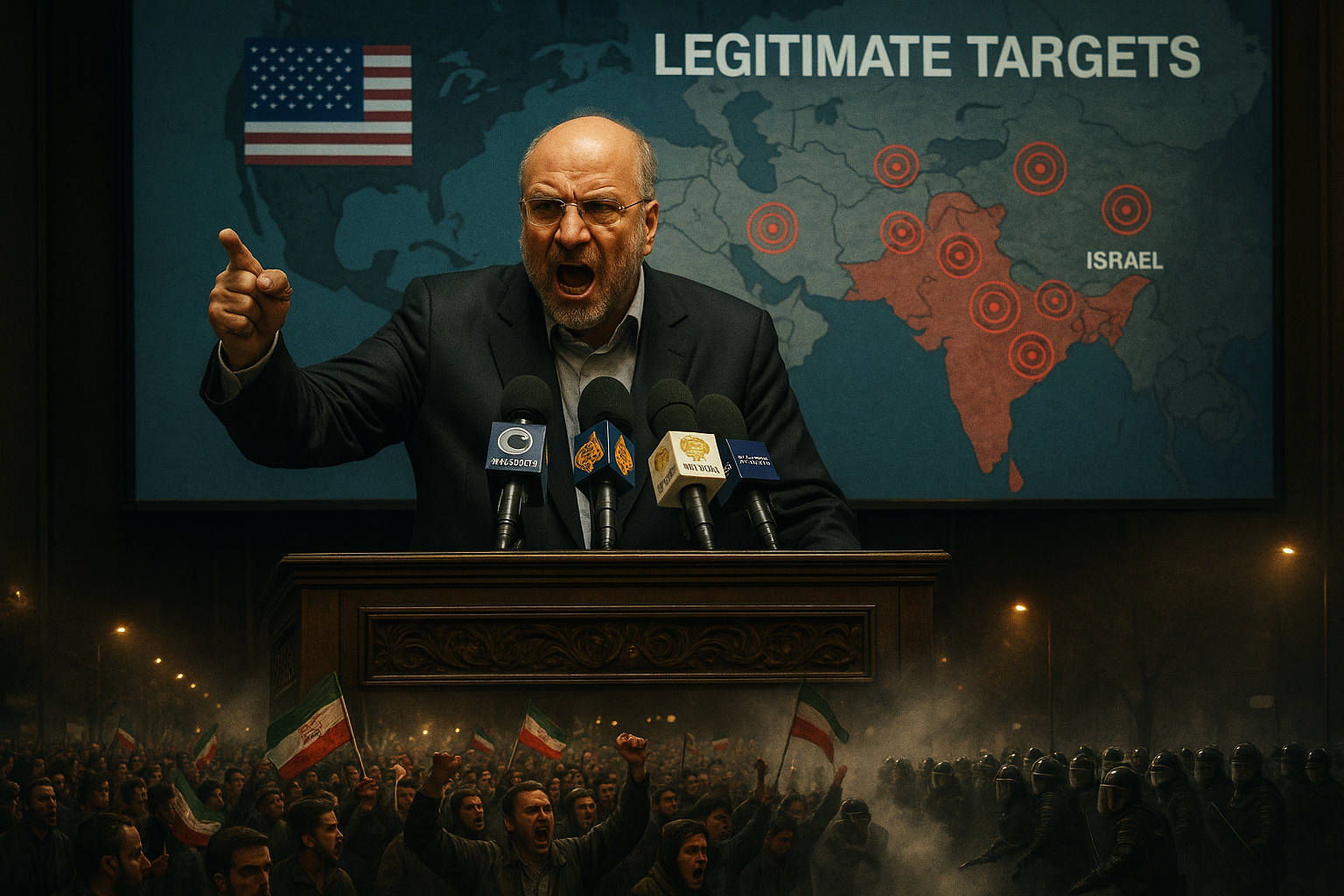 Dramatic illustration of Iran's parliament speaker threatening U.S. and Israel amid ongoing anti-government protests.
