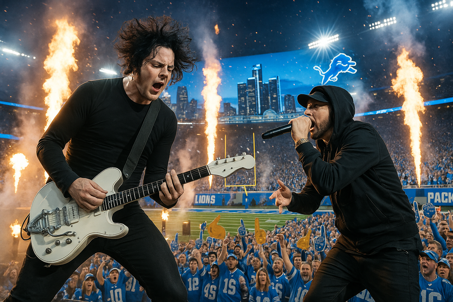Jack White stand bei der Halbzeitshow des Thanksgiving-Spiels der Detroit Lions gegen die Green Bay Packers am 27. November 2025 in Ford Field an der Spitze und brachte den Überraschungsgast Eminem für eine Performance von 'Till I Collapse' heraus. Die Veranstaltung markierte den Start einer mehrjährigen Partnerschaft mit Eminem und seinem Manager Paul Rosenberg zur Produktion der Lions-Thanksgiving-Halbzeitshows bis 2027. Whites Set feierte Detroits Musiktradition mit energiegeladenem Rock und Rap.