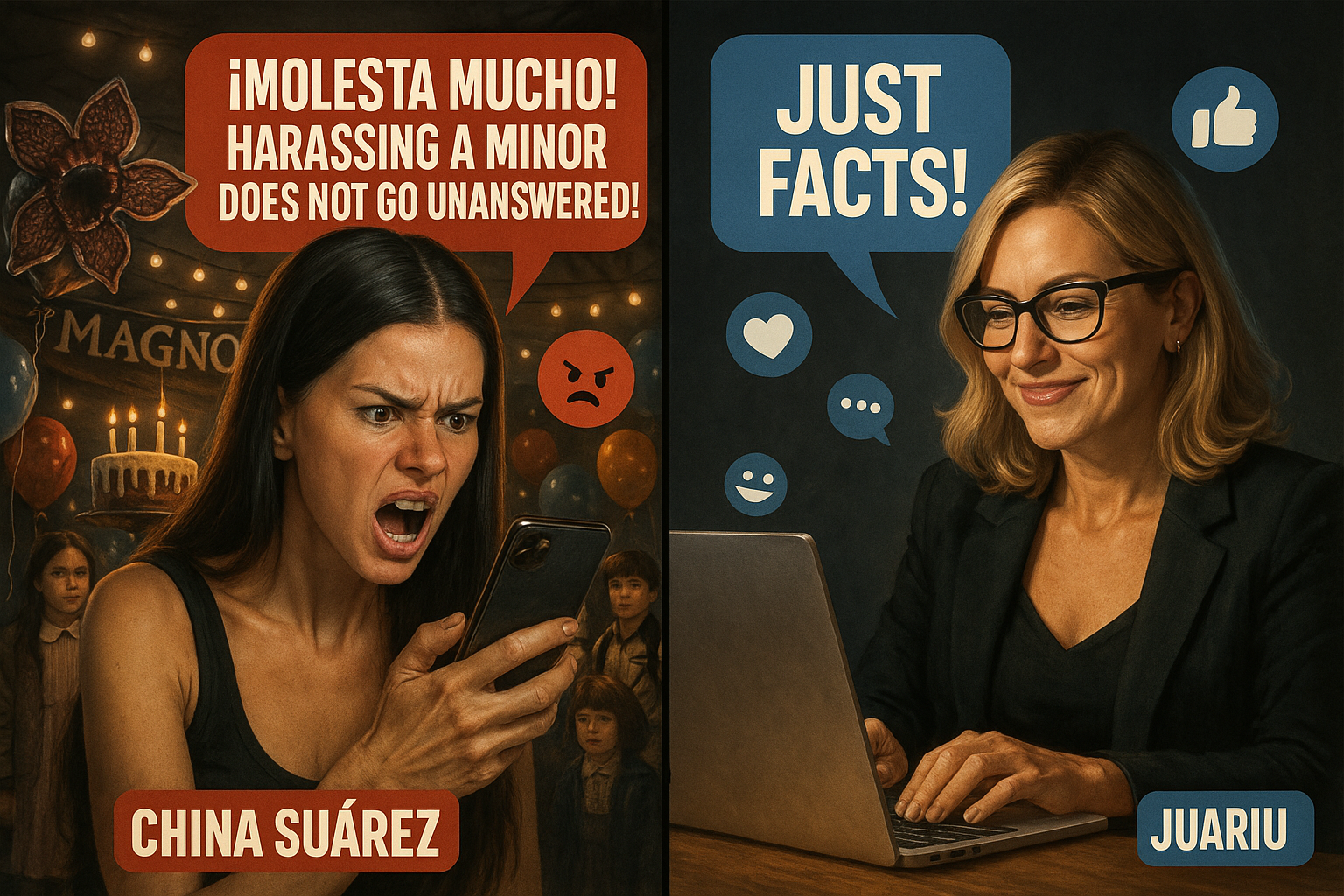 Die Journalistin Juariu hat die Kritik der Schauspielerin China Suárez zurückgewiesen, die ihr vorwarf, ihre Tochter Magnolia nach Kommentaren zur Geburtstagsfeier des Mädchens zu belästigen. Der Streit entbrannte in den sozialen Medien, nachdem Suárez Details zur Stranger-Things-Themenfeier teilte, die von Benjamín Vicuña organisiert wurde. Suárez ließ nichts anbrennen und nannte Juariu „sehr m...“ sowie dass Belästigung eines Minderjährigen nicht unbeantwortet bleibe.