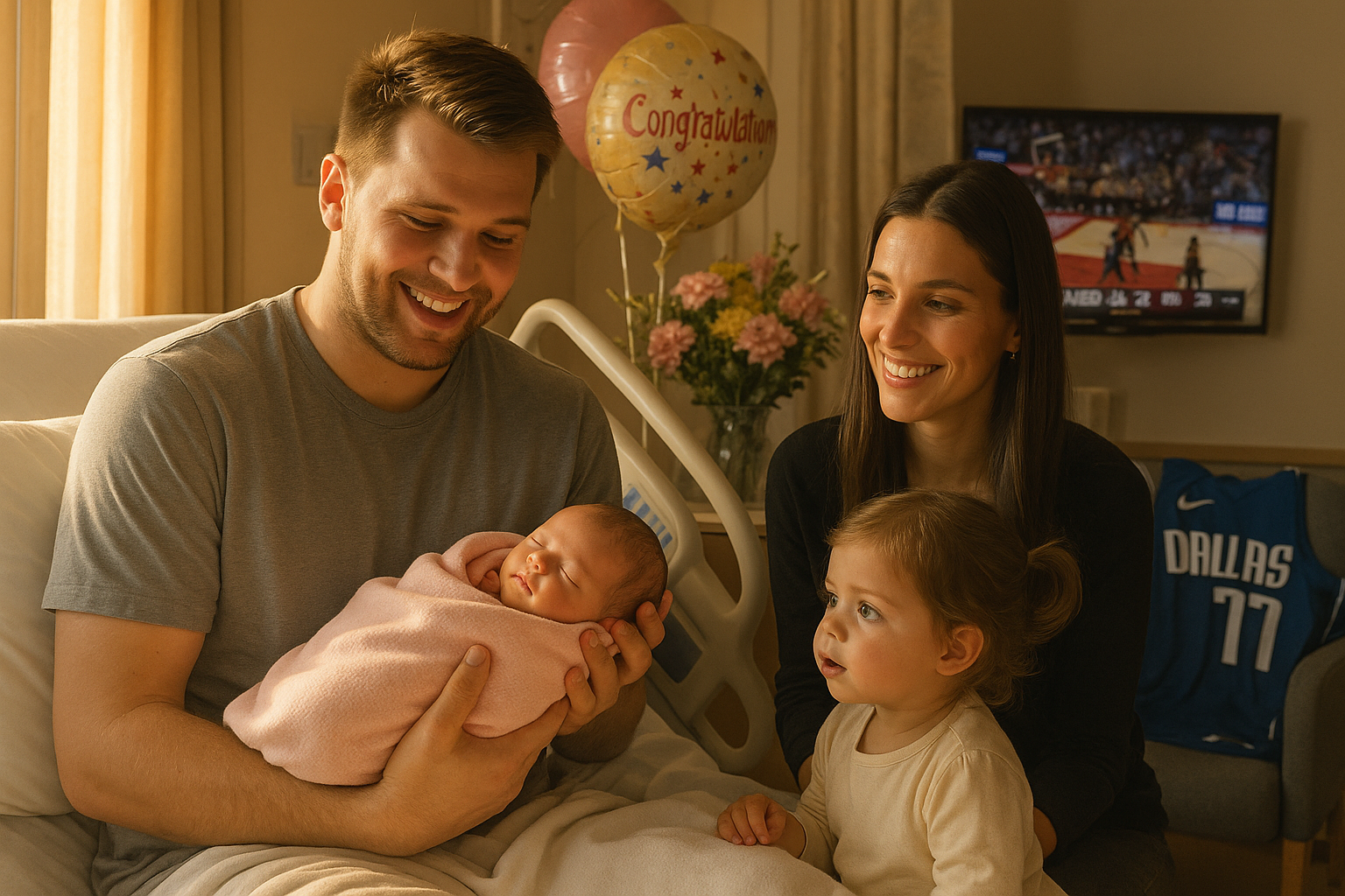Luka Dončić holds his newborn second daughter in hospital room, missing Lakers vs. Raptors game for family reasons.