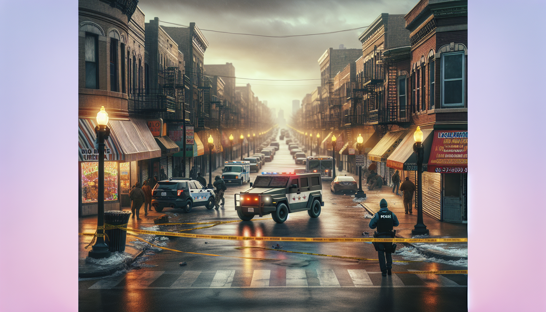 Scene of Border Patrol agents and police at the site of a shooting incident in Chicago’s Little Village, with a black Jeep suspect fleeing.