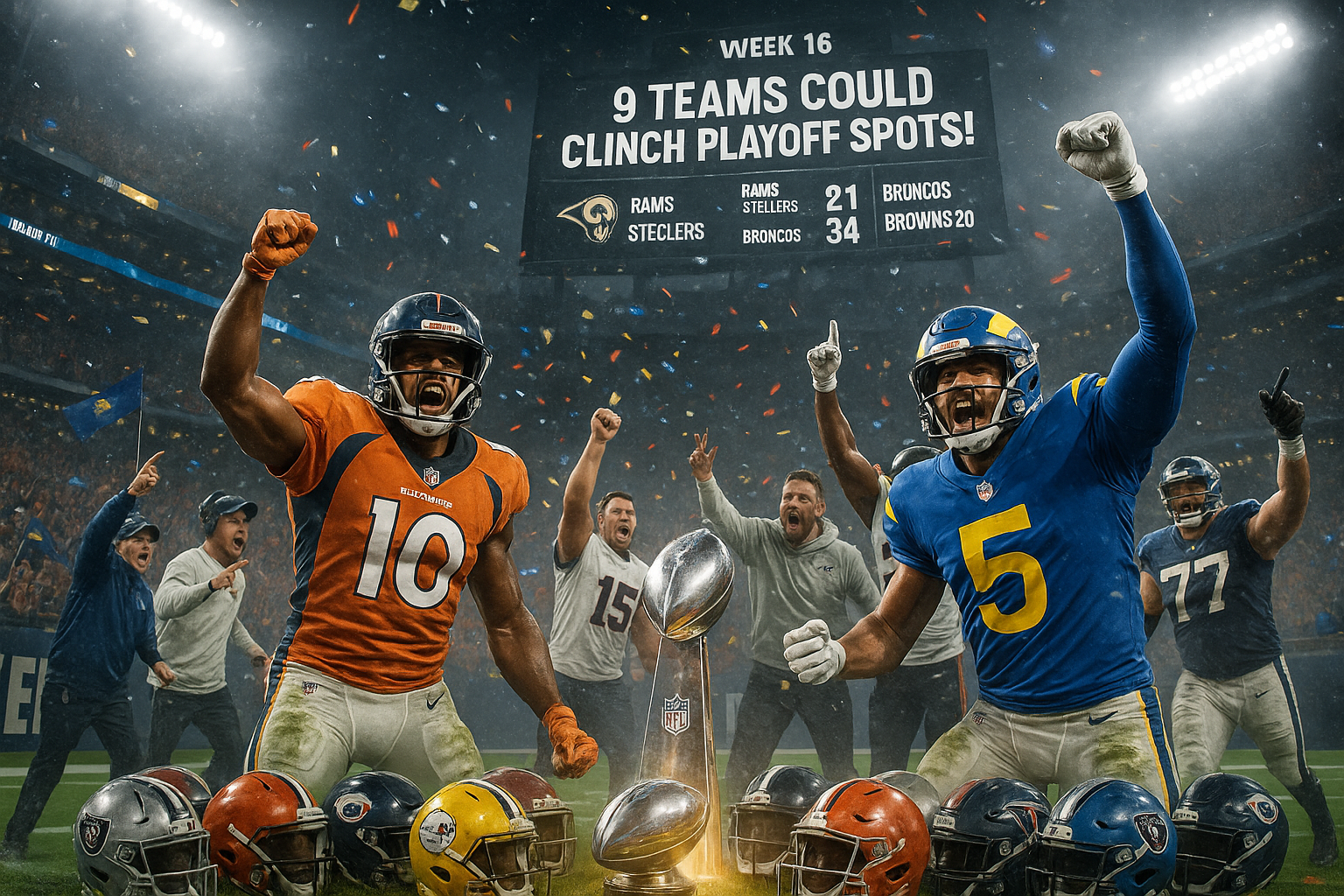Dramatic stadium scene of NFL Week 16 excitement as nine teams vie for playoff clinches, with Broncos and Rams already secured.