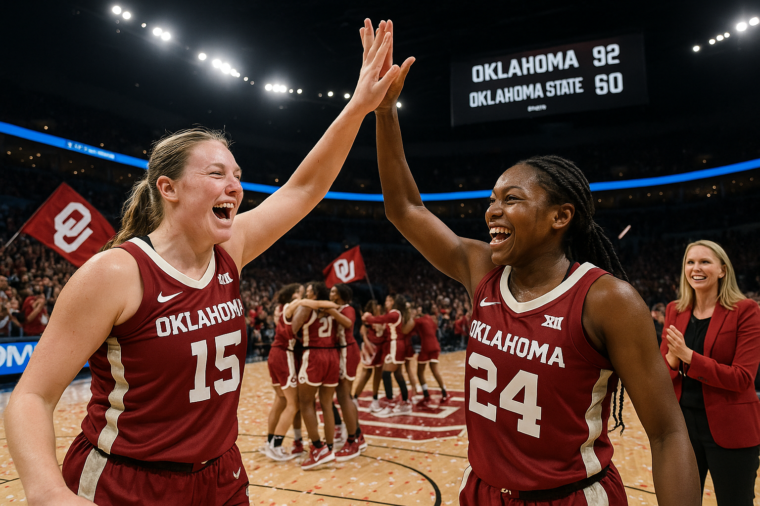 The ninth-ranked Oklahoma Sooners women's basketball team won 92-60 against No. 23 Oklahoma State in Saturday's Bedlam contest at the Paycom Center in Oklahoma City. The victory extended OU's winning streak to 10 games, the longest under coach Jennie Baranczyk. Standout efforts from Raegan Beers and Sahara Williams underscored the team's progress ahead of SEC play.