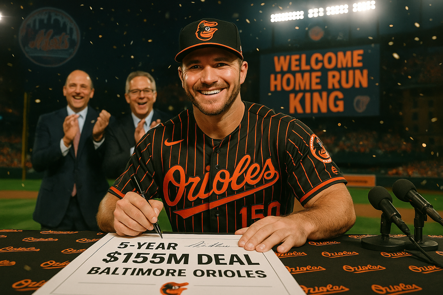 Pete Alonso in Orioles uniform signing his $155 million contract, strengthening Baltimore's lineup.