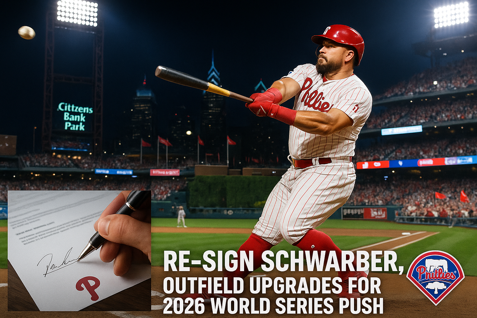 Illustration of Phillies' Kyle Schwarber hitting a home run, symbolizing re-signing and 2026 outfield upgrades.