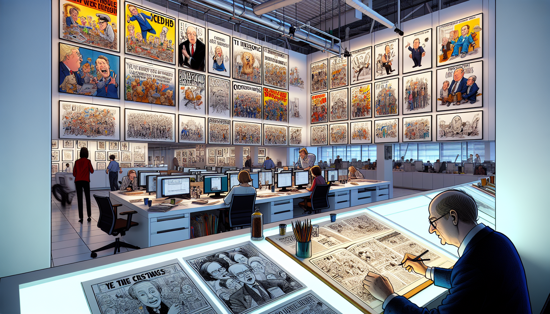 Realistic photo illustration of POLITICO's Cartoon Carousel, a weekly gallery of political editorial cartoons curated and edited by Matt Wuerker, displayed in a bustling newsroom setting.