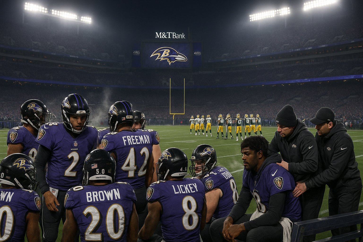 Lamar Jackson, zweifacher MVP, gilt als fraglich nach einer Rückenprellung, die ihn in der Halbzeit des 28-24-Niederlag gegen die New England Patriots der letzten Woche ans Band warf. Tyler Huntley wird erwartet als Starter, mit Runningback Derrick Henry als Schlüsselwaffe nach 128 Yards und zwei Touchdowns gegen die Patriots – obwohl er spät im Spiel wenig Einsatz hatte. Trainer John Harbaugh betonte Ball-Sicherheit, da die Ravens mit 12 verlorenen Fumbles ligaweit führen.