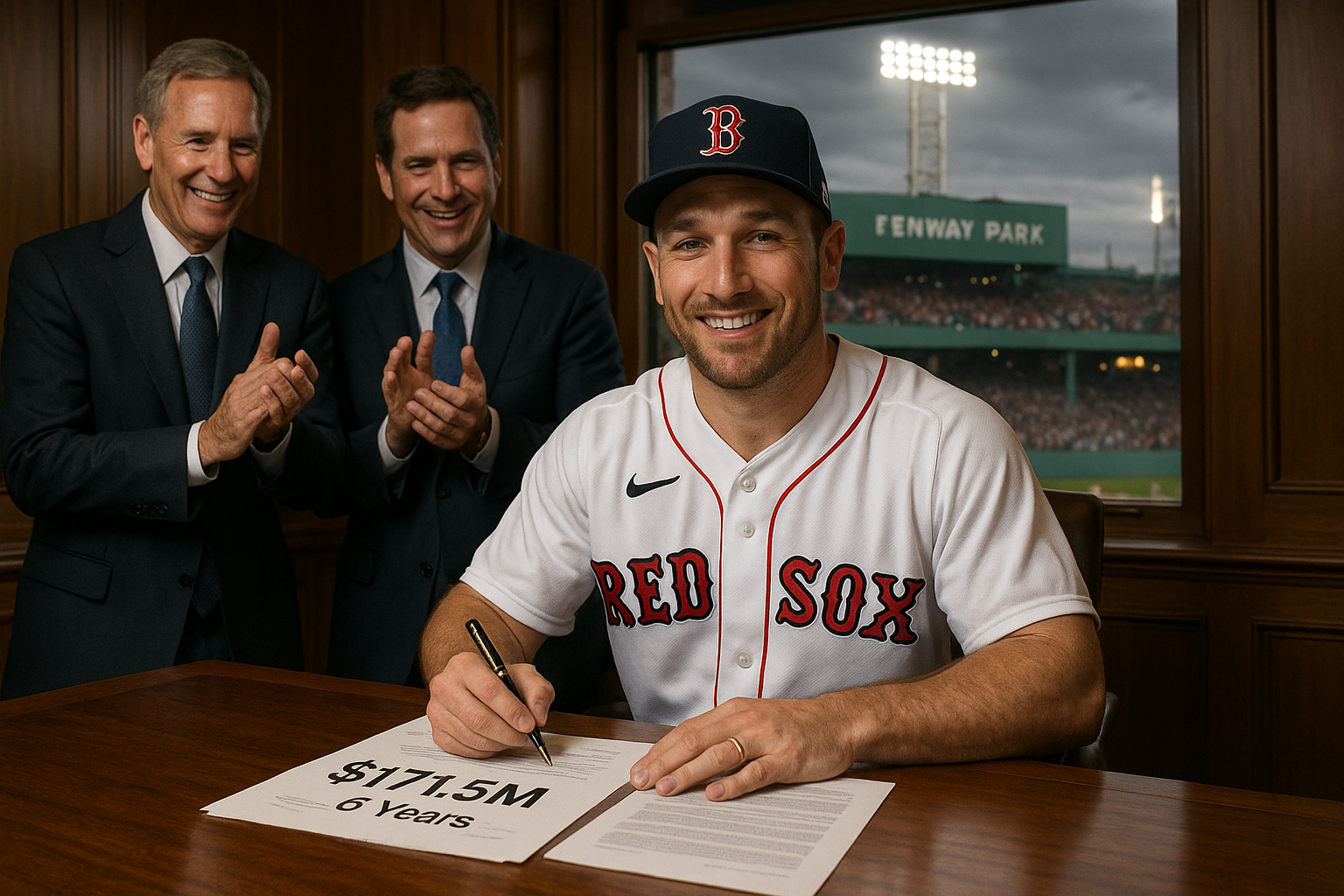 Alex Bregman in Red Sox uniform at Fenway Park, with symbolic rival team logos representing intense contract pursuit.