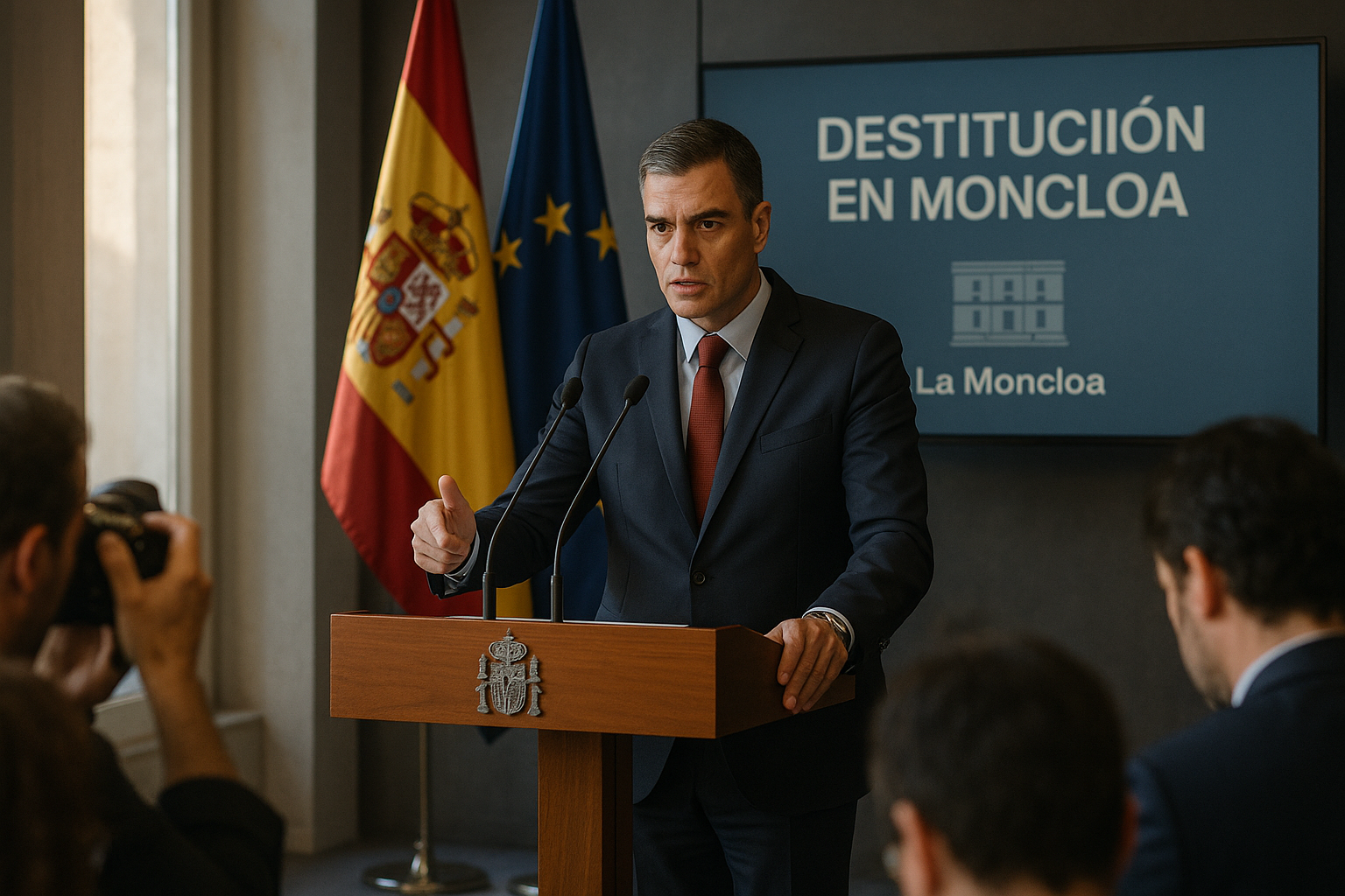 Spanish PM Pedro Sánchez at La Moncloa podium announcing dismissal of official amid sexual harassment scandal.