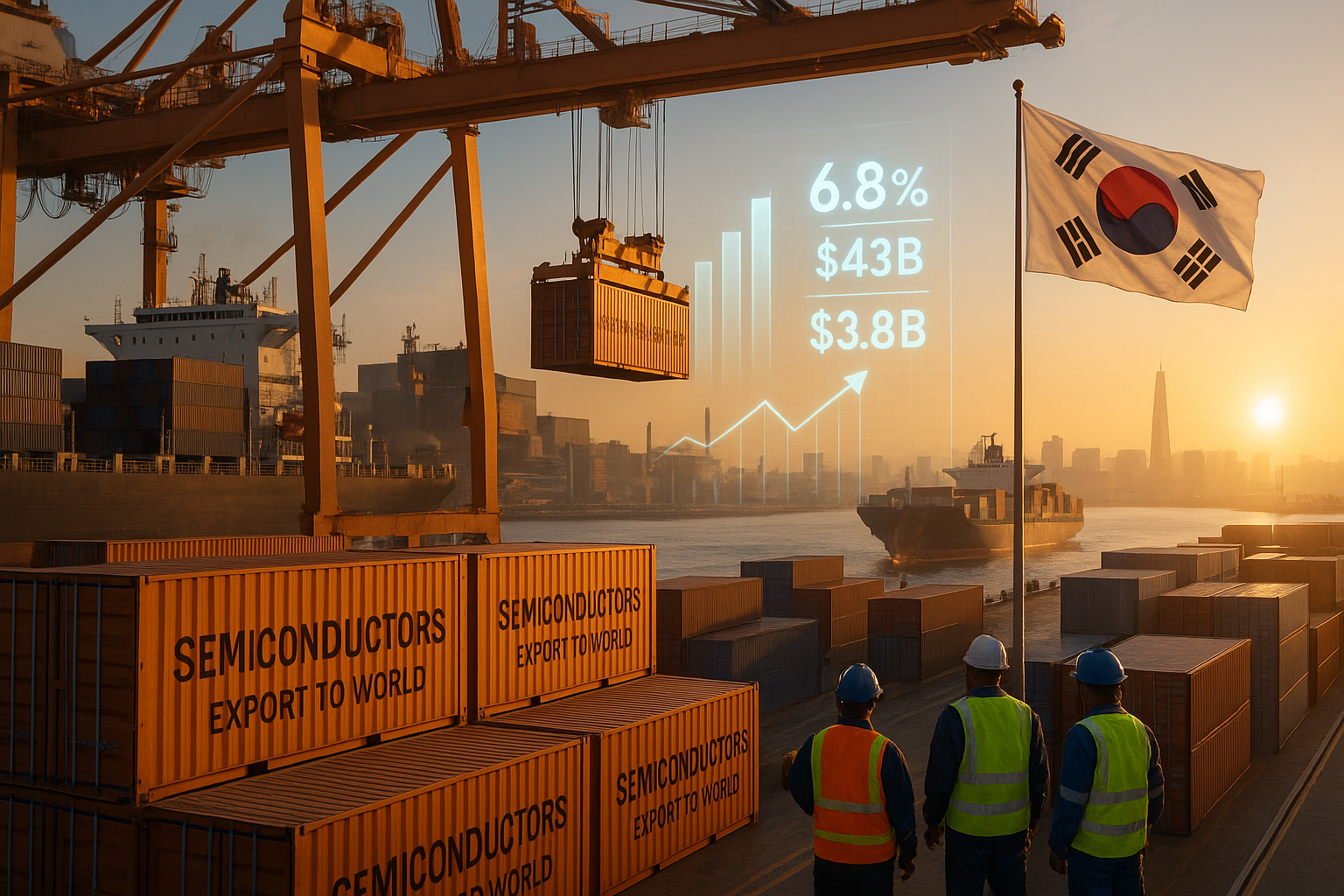 Busy South Korean port illustrating record 6.8% export growth to $43 billion, driven by semiconductors, with expanding trade surplus.
