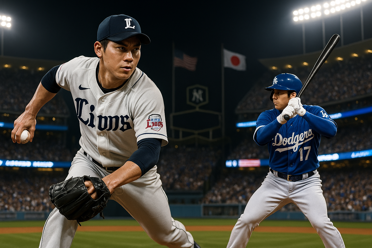 Photorealistic illustration of Seibu Lions pitcher Tatsuya Imai challenging Dodgers' Shohei Ohtani on the mound at Dodger Stadium.