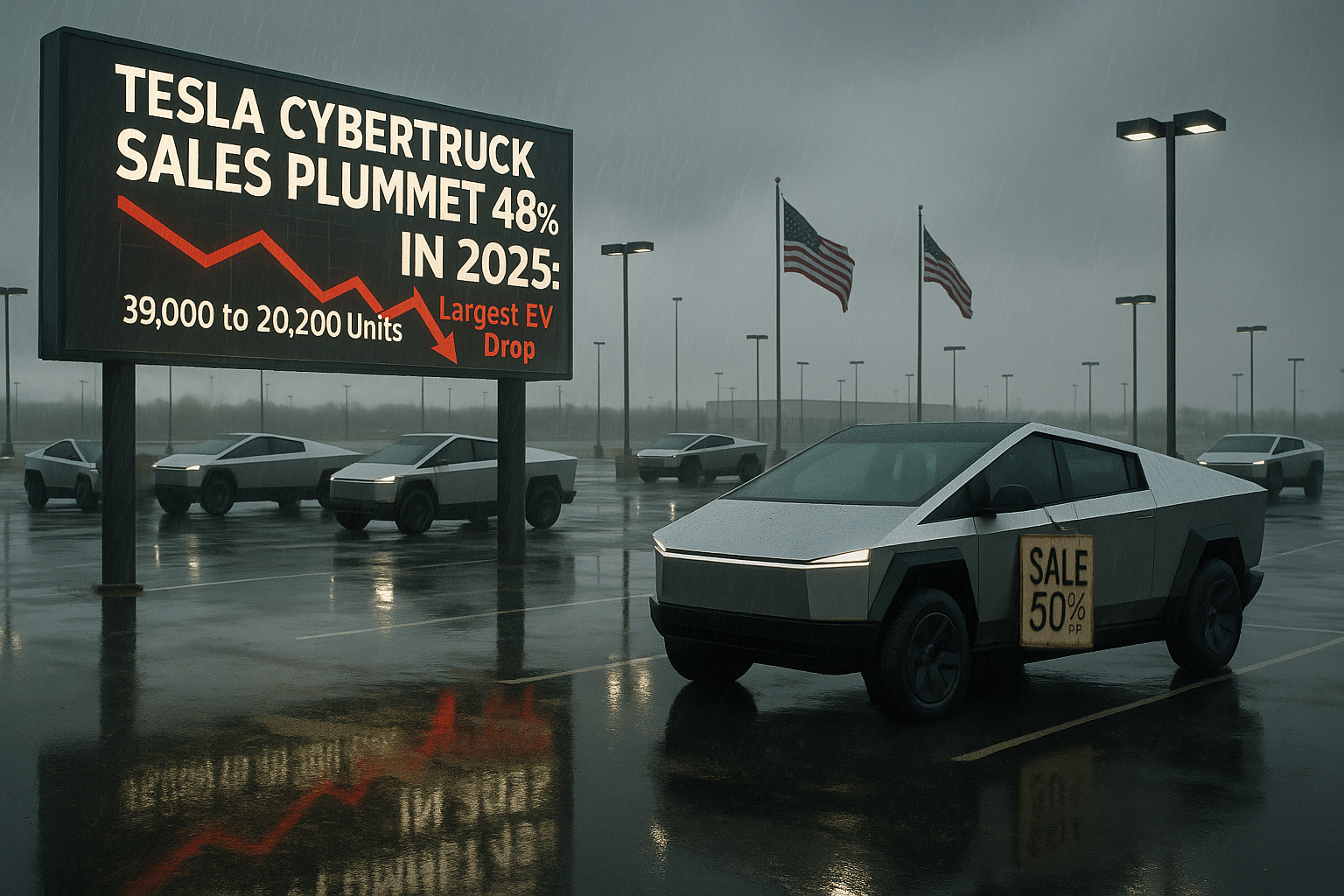 Illustration depicting sharp decline in Tesla Cybertruck sales with nearly empty rainy dealership lot and plummeting sales graph billboard.