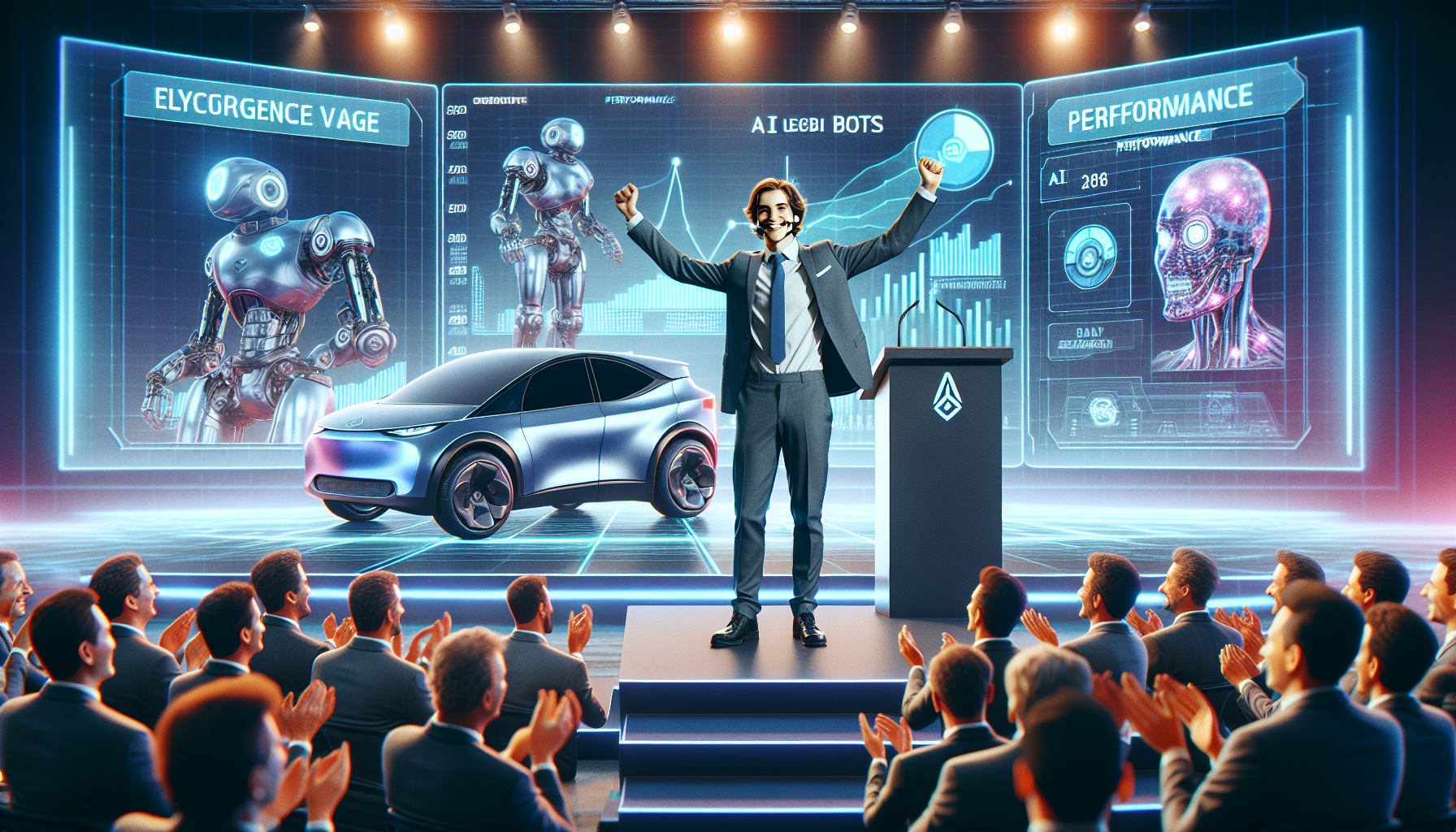 Elon Musk celebrates shareholder approval of his massive compensation package at Tesla's 2025 annual meeting, surrounded by applauding investors and displays of innovative technology.