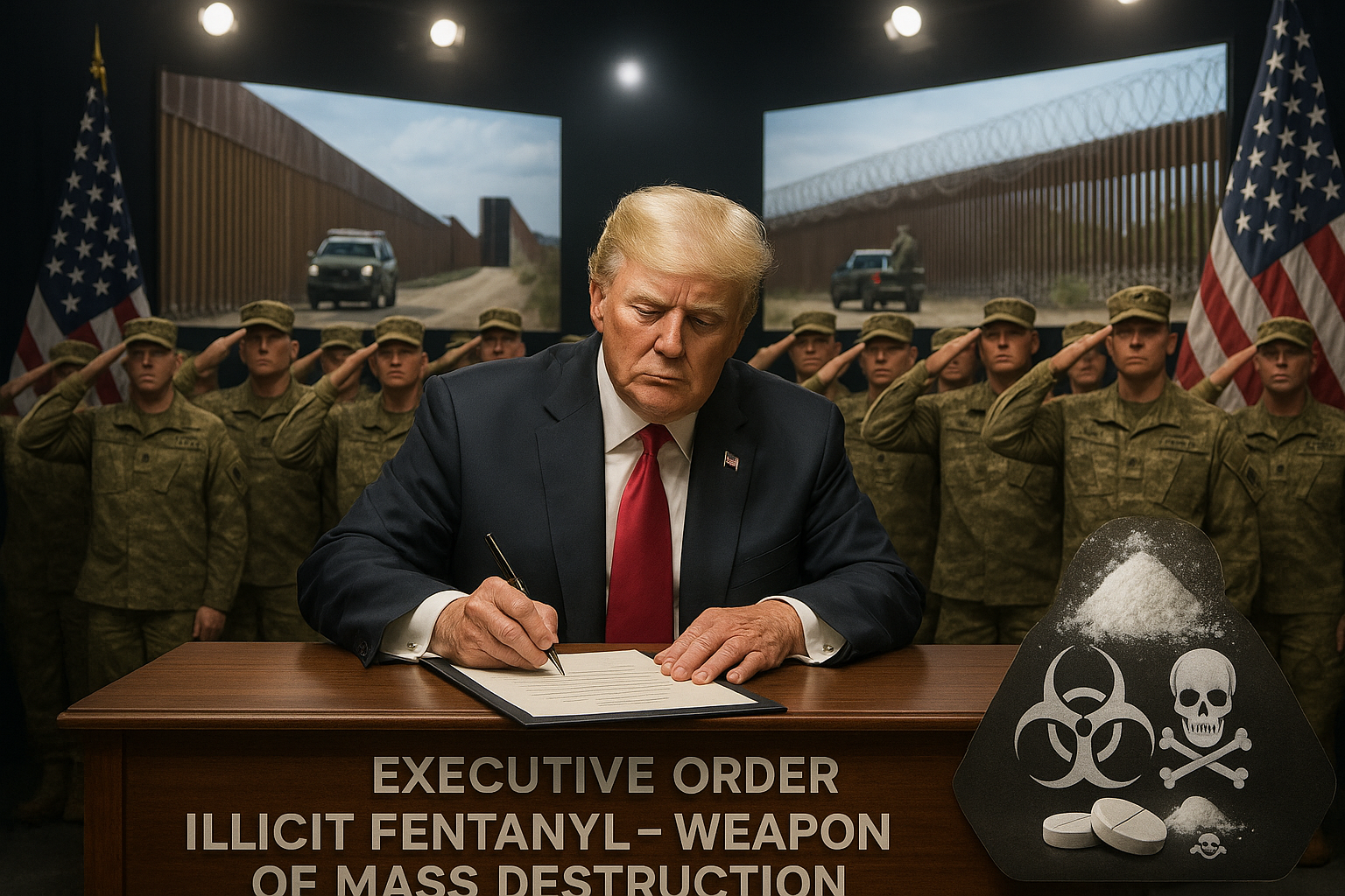 President Trump signs executive order designating illicit fentanyl as a weapon of mass destruction, honoring U.S. troops securing the Mexico border.
