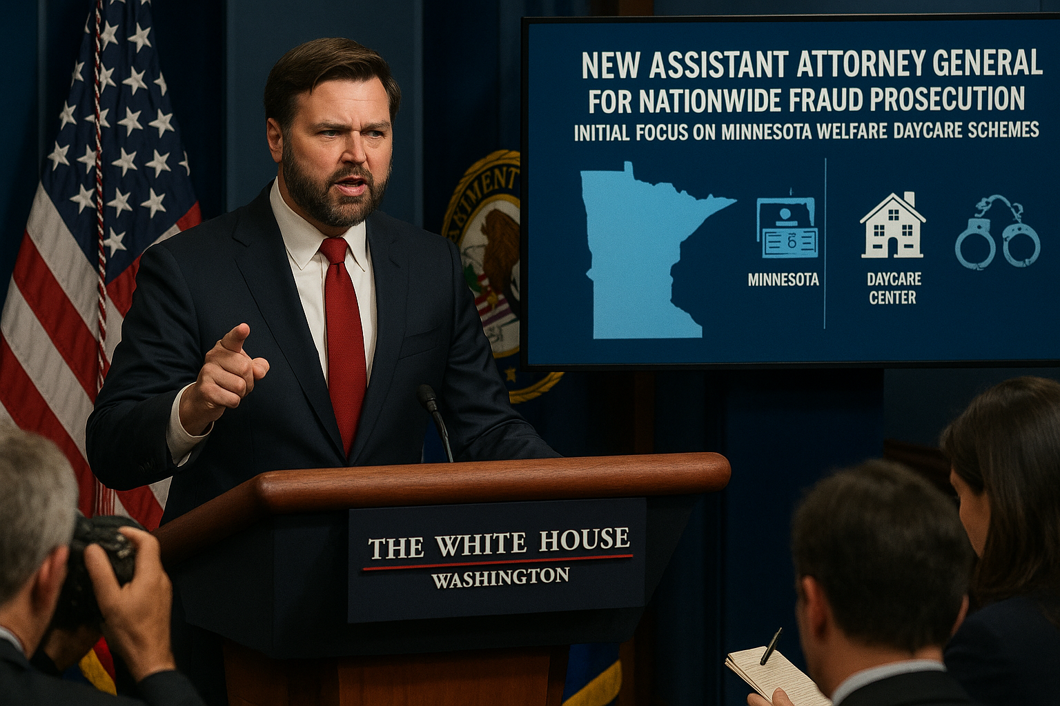 Vice President JD Vance announced the creation of a new assistant attorney general position in the Justice Department to prosecute fraud nationwide, with an initial focus on Minnesota. The move addresses allegations of widespread welfare and daycare fraud schemes, particularly those involving Somali immigrants. Senate Judiciary Chairman Chuck Grassley welcomed the initiative as positive news for taxpayers.