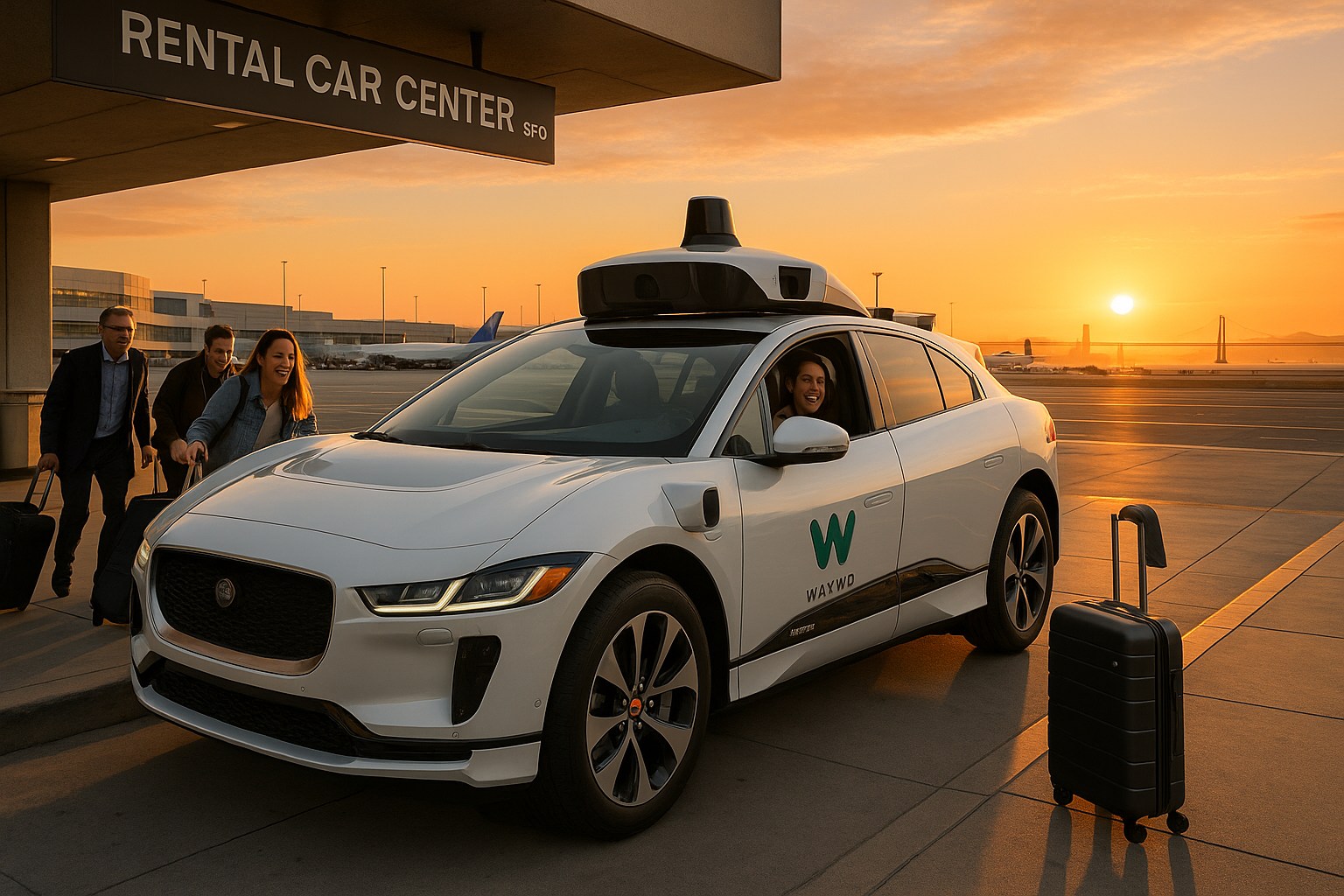Waymo robotaxi arriving at SFO Airport Rental Car Center for passenger pickup, highlighting new autonomous service launch.