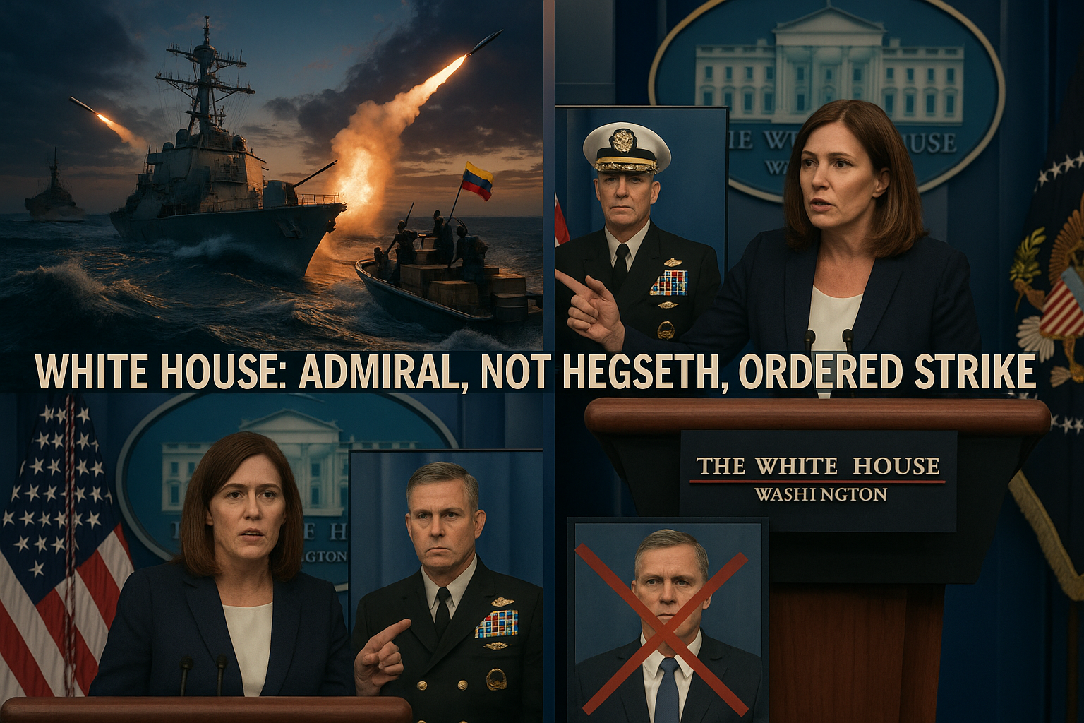 Dramatic photo illustration of U.S. naval strike on Venezuelan boat with White House clarification that admiral, not Pete Hegseth, issued the order amid war crime concerns.
