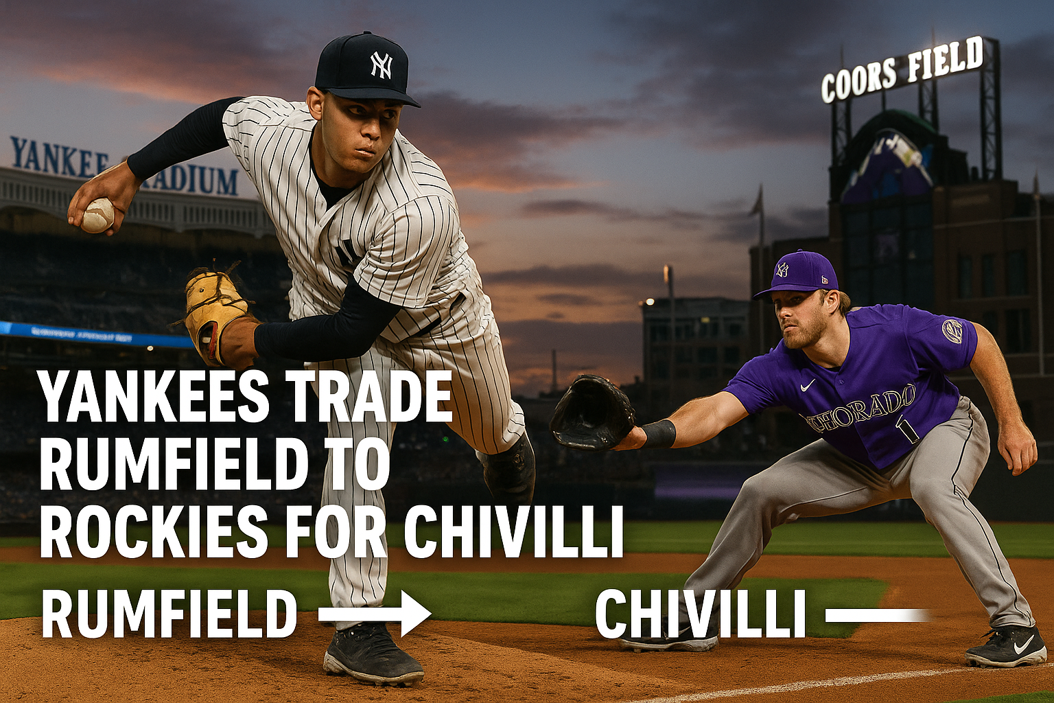 Dynamic illustration depicting the Yankees-Rockies trade of pitcher Angel Chivilli for prospect T.J. Rumfield.