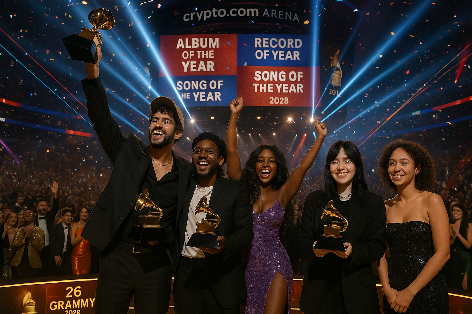 Photorealistic scene of 2026 Grammy winners Bad Bunny, Kendrick Lamar, SZA, Billie Eilish, and Olivia Dean celebrating on stage at Crypto.com Arena amid confetti and lights.