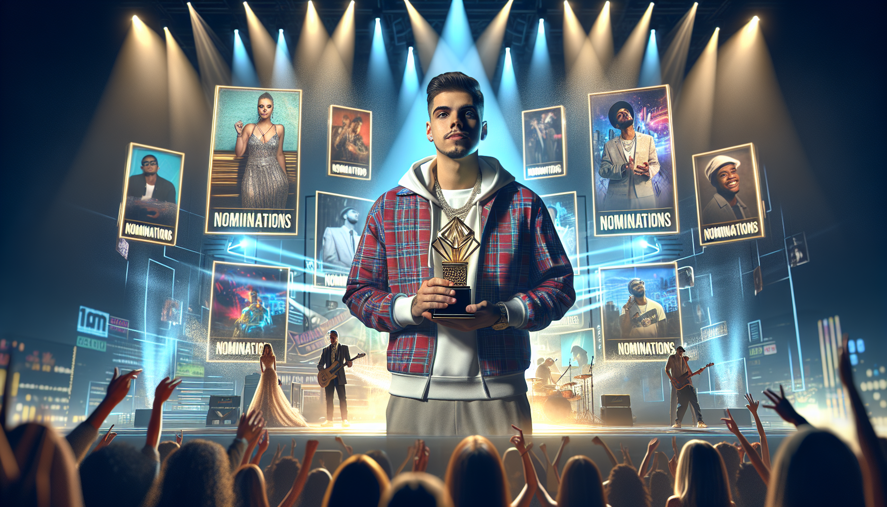 Kendrick Lamar leading the 2026 Grammy nominations with nine nods, alongside Lady Gaga and Bad Bunny, illustrated in a vibrant stage setting for a news article on music awards.