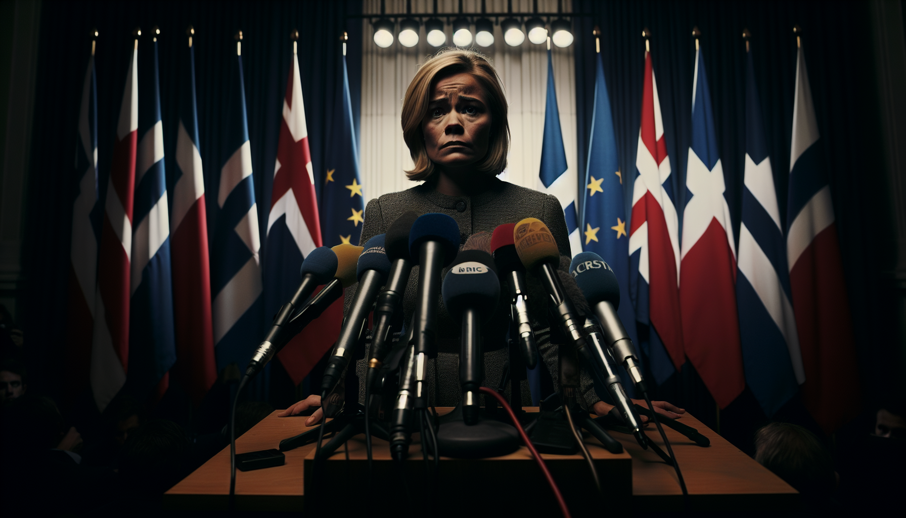 Anna-Karin Hatt at a press conference resigning as Center Party leader amid threats, looking serious with party symbols in the background.