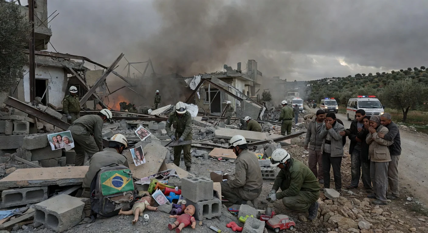 Aftermath of Israeli airstrike in southern Lebanon where Brazilian mother and child were killed: rubble-strewn destroyed home with rescuers searching amid smoke and personal items.